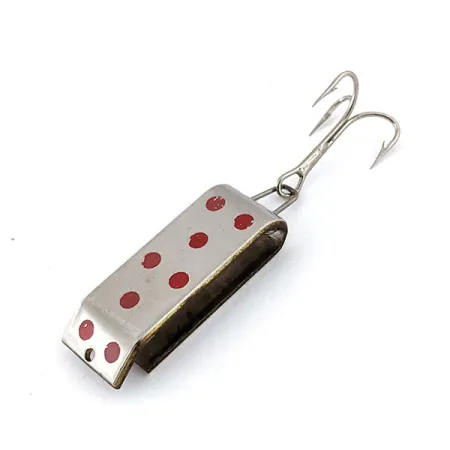 Na leštěném niklovém povrchu tohoto kusu je vyraženo sedm výrazných červených teček, které vytvářejí vysoce kontrastní vzor navržený pro dobrou viditelnost v různých světelných podmínkách. Lil Jake od značky Jake's Lures s hmotností 9 g (1/3 oz) se vyznačuje specifickým ohýbaným obdélníkovým tělem, které měří přesně 3,5 cm (1 1/2"). Tento konkrétní kus s produktovým kódem 15872 byl vyroben v USA a zůstává ve špičkovém stavu 5/5. Osazení tvoří ostrý trojháček připevněný ke kovovému očku v zadní části, zatímco vpředu se nachází čistě vyražený otvor pro navázání. Unikátní geometrie ohýbaného niklového plátu ji odlišuje od tradičních konstrukcí plandavek a odráží inovativní přístup, který firma Jake's Lures zvolila u svého vybavení vyráběného v USA.