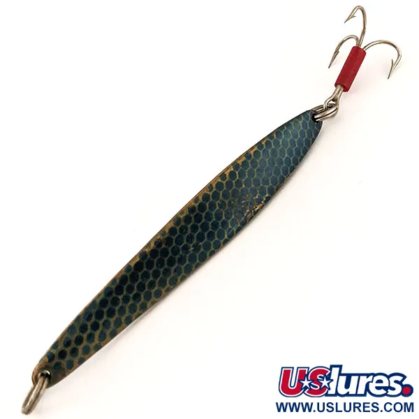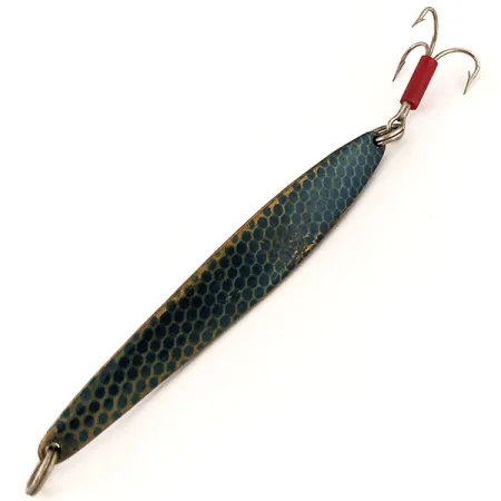 Hmotnost 31 g (1 oz) poskytuje hustotu potřebnou k dosažení hlubokých struktur nebo k proražení větru při dlouhém náhozu. Tato nástraha Johnson Lujon, katalogizovaná pod produktovým kódem 13032, se vyznačuje výrazným modrým vzorem včelí plástve, který dodává jejímu 9 cm (3 1/2") tělu vizuální texturu. Kovový povrch je výjimečně zachovalý a položka má hodnocení stavu 5/5, takže vypadá připravená do vitríny nebo do pouzdra na nástrahy. Červená plastová trubička u základny trojháčku slouží jako klasický vizuální atraktor a bod útoku pro ryby. Prodloužený profil a mírný kýl na břiše jsou charakteristické pro americké kovové nástrahy z poloviny století určené k jigování nebo přívlači. Oba konce jsou osazeny robustními kroužky, které zajišťují bezpečné spojení s návazcem a háčkem. Tento exemplář vyrobený v USA odráží odolné konstrukční techniky, které zpevnily jméno Johnson jako základ v oblasti vybavení pro vertikální jigging.
