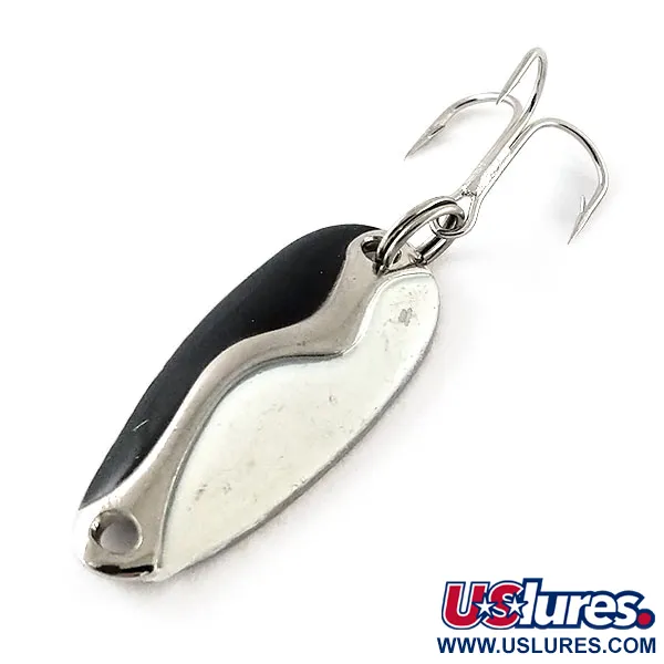 Leštěný niklový povrch a výrazný černý akcent definují vizuální charakter této 3,5cm (1 1/2") třpytky. Ražba „KAMLOOPER JUNIOR“ přímo na kovu na zadní straně potvrzuje její identitu jako klasické nástrahy Acme vyrobené v USA. Tento exemplář s produktovým kódem 13254 váží 7 g (1/4 oz) a udržuje si hodnocení stavu 5/5, což vykazuje výjimečně čistý povrch bez výrazného opotřebení. Vlnité rozhraní mezi horní černou částí a stříbrnou dolní polovinou vytváří výrazný profil určený pro viditelnost v různých podmínkách čistoty vody. Třpytka je vybavena pevným kroužkem a ostrým trojháčkem, přičemž oba prvky zůstávají ve vynikajícím funkčním stavu. Zadní strana třpytky je dokončena vysoce reflexní stříbrnou barvou pro maximalizaci záblesků při nahazování nebo trollingu.