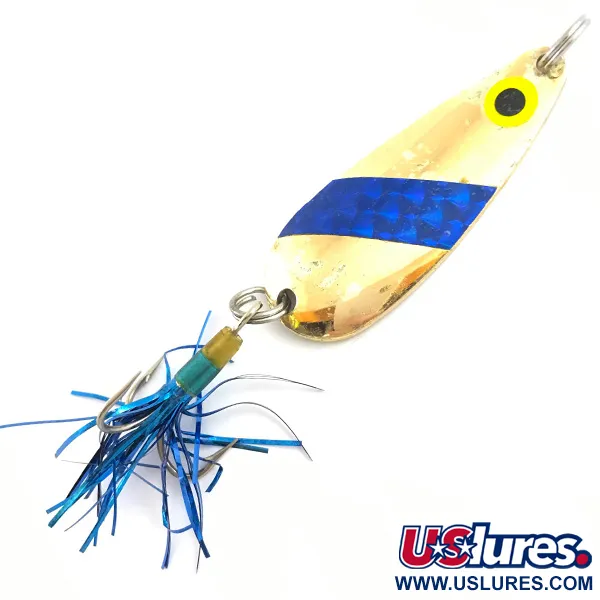 Tato plandavka Lindy Finsel o hmotnosti 10g (1/3oz) se vyznačuje klasickým pozlaceným povrchem doplněným o zářivý modrý holografický proužek. Kapkovitý tvar těla o délce 5,5cm (2 1/4") je typickým znakem tradice výroby Lindy / Little Joe. Tento konkrétní exemplář s kódem produktu 4530 má namalované žluté oko s černou zornicí umístěné poblíž horního kroužku. Koncová výbava se skládá z ostrého trojháčku zdobeného modrým pozlátkem, který drží dvoubarevný tyrkysově-zlatý kroužek. Kovové tělo vyrobené v USA odráží vysoce kvalitní techniky pokovování, které Lindy-Little Joe v této éře používala. Stav je hodnocen stupněm 4/5, což značí čistý, dobře zachovalý povrch, který si zachovává svůj původní lesk na kovu i dekorativní pásce. Na vnitřní konkávní straně nástrahy se nachází vyražená značka výrobce, která sběratelům zaručuje její autentičnost.