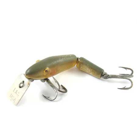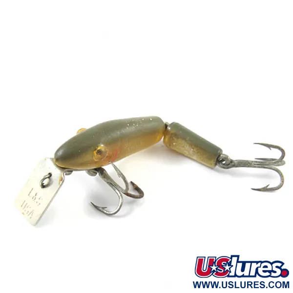 Na kovové potápivé lopatce je jasně vyražena klasická značka „L&S USA“, která tento kus identifikuje jako autentický výrobek společnosti L&S Bait Company. Tento exemplář MirrOlure Bass-master se vyznačuje dělenou konstrukcí těla s povrchovou úpravou v decentní paletě Golden Natural, která přechází z olivového hřbetu do teplé, průsvitné spodní části. S velikostí 1 1/2" (4 cm) a hmotností 1/16 oz (2 g) je nástraha kompaktním nástrojem pro nahazování. Pod produktovým kódem 2747 si nástraha zachovává původní osazení, včetně dvou břišních trojháčků a charakteristické kovové lopatky. Stav je hodnocen 4/5, protože povrchová úprava i strukturální integrita zůstávají u obou segmentů těla pevné.