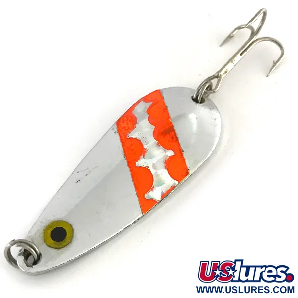 Tato 6 cm dlouhá plandavka Moriyama je ukázkou řemeslného zpracování, které bylo typické pro japonské rybářské náčiní poloviny minulého století. Leštěný povrch v barvě Nikl / Červená je velmi výrazný, s širokým diagonálním červeno-oranžovým pruhem, který rámuje unikátní texturovanou stříbrnou vložku navrženou pro odraz světla. Na přední straně tvoří výrazné žluto-černé oko bod zájmu poblíž očka. Tato nástraha s kódem produktu 8278 váží 16 g, což jí dodává solidní hmotnost vhodnou pro přívlač i trolling. Na zadní straně je do konkávního niklového povrchu vyražena značka výrobce „Moriyama Japan“. Osazení, včetně trojháčku a kroužků, je ve vynikajícím stavu, s hodnocením kvality 5/5.