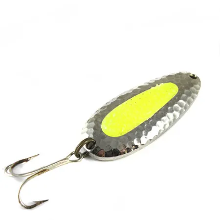 Těžká tepaná niklová povrchová úprava dodává této 28g (1 oz) plandavce výrazný reflexní povrch, který zachycuje světlo i v hluboké nebo zakalené vodě. Tato Nebco Pixee, označená produktovým kódem 0510, je vybavena charakteristickou neonově žlutou vložkou imitující lososí jikru, což je určující designový prvek z éry National Expert Bait Co. před přechodem značky pod Blue Fox. S délkou 6,4 cm (2 1/2") poskytuje těžká mosazná konstrukce potřebnou hmotnost pro dosažení hlubokých říčních tůní nebo pro daleké hody proti pobřežnímu větru. Na zadní straně je vyražen název Nebco PIXEE a informace o patentu, ačkoliv tento konkrétní exemplář je označen 7/8 oz, přičemž podle katalogových specifikací váží plných 28 g (1 oz). S hodnocením 4/5 vykazuje nástraha lehké povrchové opotřebení niklování a mírnou oxidaci na původním trojháčku. Je navržena pro různé techniky, od plynulého přitahování v příboji až po odvalování v říčních proudech při lovu pstruhů duhových a lososů. Žlutá vložka slouží jako vizuální spouštěč imitující jikry, což z ní činí základní výbavu pro lovce pstruhů a lososů.