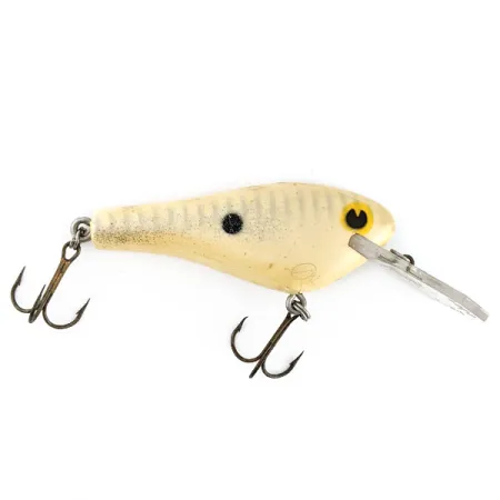 Tento ručně vyráběný cedrový crankbait o hmotnosti 16 g (3/5 oz) se vyznačuje robustním chodem, díky kterému se značka Poe's stala legendou v turnajovém lovu okounků. Super Cedar RC-3 s produktovým kódem 22032 má 7 cm (2 3/4") dlouhé tělo vysoustružené z cedrového dřeva. Tento materiál byl zvolen pro svou hustotu a specifický vztlak při náhozech. Tento konkrétní kus je v klasickém barevném provedení cream shad, doplněném o výraznou černou boční skvrnu a žluté oči s tmavými zornicemi. V přední části je osazena široká, čirá plastová nořící lopatka navržená tak, aby při plynulém navíjení vedla nástrahu do hloubky. Osazení tvoří dva původní trojháčky na břiše a ocasu, které nesou lehké známky stáří odpovídající jejich historii. Vyrobeno v USA. Tělo si zachovává čistý vzhled, přičemž stav je hodnocen stupněm 4/5 kvůli stopám po lehkém používání u vody.