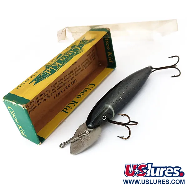Tento vintage exemplář o hmotnosti 1/2 oz (14 g) se vyznačuje hluboko potápivým profilem s nade dimenzovanou, nastavitelnou kovovou lopatkou. Celková délka 9,5 cm činí z Wallsten Tackle Cisco Kid skvělou volbu pro těžkou přívlač při lovu štik a muskallungů. Tato nástraha s produktovým kódem 10173 má sytě černou povrchovou úpravu se stříbrnými flitry a výrazným bílým proužkem kolem krku. Tento kus je nepoužitý a je uchován v originální žluto-zelené krabičce s průhledným plastovým víčkem. Nastavitelná kovová lopatka je typickým znakem řady Cisco Kid a umožňuje rybáři doladit chod tak, aby nástraha dosáhla požadované hloubky dle aktuálních podmínek. Podle původního návodu na balení toto ruční nastavení dovoluje precizní kontrolu hloubky při trollingu i klasickém nahazování. Malované oči v bílé barvě s černým středem ostře kontrastují s tmavým, tečkovaným tělem.