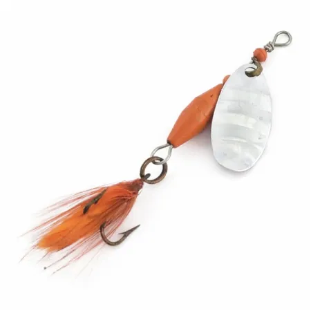 Značení jasně vyražené do stříbrného listu identifikuje tuto konkrétní nástrahu Abu Garcia Spinnaren Reflex jako velmi zachovalý exemplář. Rotační třpytka o hmotnosti 1/8 oz (4 g) je postavena na niklovém listu s jamkami, který zajišťuje stálé odlesky. Zářivě oranžové tělíčko doplňuje ladící oranžové peří na trojháčku, které dodává 5cm profilu na objemu. Červené plastové korálky na drátěném rámu fungují jako ložiska usnadňující rotaci třmínku během navíjení. Tato nástraha, registrovaná pod produktovým kódem 24622, je ve stavu 5/5 se všemi plně funkčními součástmi.