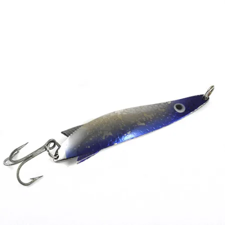 Tato švédská plandavka o hmotnosti přesně 18 g (2/3 oz) se vyznačuje charakteristickou povrchovou úpravou Nikl / Modrá, kterou sběratelé okamžitě rozpoznají. 9cm (3 1/2") tělo této Abu Toby, označené produktovým kódem 0961, vykazuje sytě modrý odstín podél vnějších okrajů, který rámuje texturovaný stříbrný střed napodobující šupiny nástražní rybky. Poblíž hlavy je umístěno jedno černobílé oko, zatímco spodní strana zůstává v čistém niklovaném provedení, opatřeném ražbou Abu Garcia a původem ve Švédsku. Tento konkrétní exemplář obsahuje typické malé ploutvičky u ocasu a je vybaven robustním trojháčkem zajištěným kroužkem. Celkově je nástraha ve stavu 4/5, vykazuje jen velmi lehké známky stáří a zachovává si zářivý povrch.