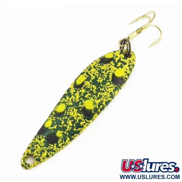 Tento model o hmotnosti 1/4 oz (7 g) se vyznačuje klasickým vzorem Frog, což je povrchová úprava tvořená zářivě žlutým základem s hustým zeleným mramorováním a výraznými žlutými tečkami s černým olemováním. Plandavka o délce 1 3/4" (4,5 cm) nese produktový kód 24431 a představuje poctivé řemeslné zpracování amerických nástrah značky Acme. Lak je ve stavu 5/5, přičemž barvy i tečkované detaily na zužujícím se kovovém těle jsou stále syté a výrazné. K zadní části je pomocí kroužku připevněn trojháček ve zlaté povrchové úpravě, který ladí s teplými tóny laku. Profil nástrahy je u hlavy úzký a směrem k ocasu se rozšiřuje, což je konstrukce navržená speciálně pro nahazování v různých vodních podmínkách.