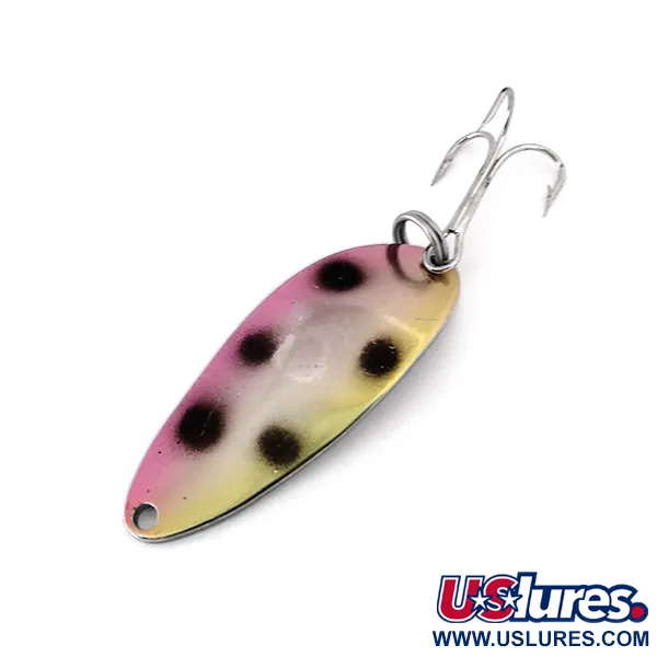Váhovka 1/3 oz (9 g) vyražená do poniklované zadní strany definuje specifikace této plandavky. Tento exemplář s kódem produktu 10299 je vzácný přechodný model z období těsně po akvizici značky společností Acme, vyznačující se ražbou „WIGL LURE“ vedle klasického názvu. Přední strana nese zářivý vzor Trout / Nickel s růžovo-žlutým gradientem a výraznými černými tečkami na těle o délce 1 3/4" (4,5 cm). Trojháček je zajištěn robustním kroužkem a špička je čistě vyražená pro upevnění návazce. Kov vyrobený v USA si zachovává brilantní lesk a barva zůstává ostrá, což odpovídá hodnocení stavu 5/5. Konstrukce z tlustého plechu poskytuje vysokou hustotu pro nahazování do hloubek nebo trolling.