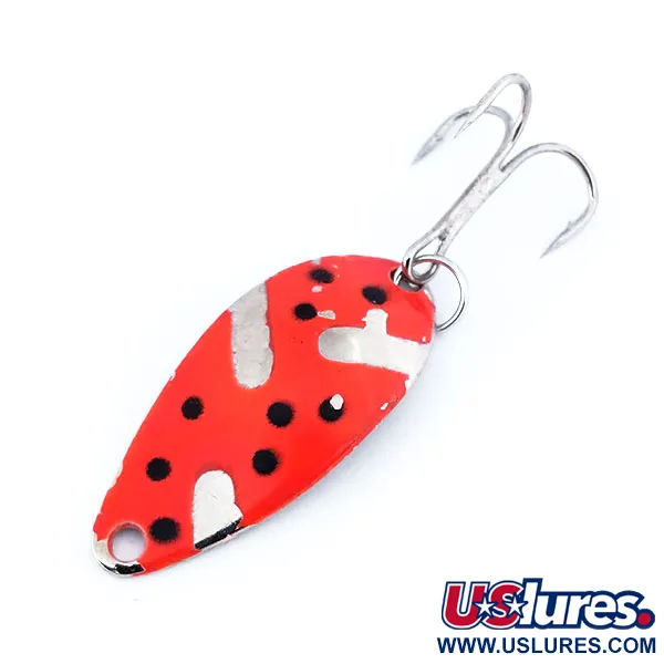 Povrchu této 3cm (1 1/4") plandavky dominuje fluorescenční červená barva, kterou doplňuje výrazný vzor černých teček na niklovém podkladu. Tato 3,5g (1/8 oz) Acme Little Cleo, označená produktovým kódem 10721, je opatřena UV aktivní vrstvou, která intenzivně září v tmavých vodách nebo pod ultrafialovým světlem. Části lesklého niklování zůstaly skrze barvu odhaleny, což vytváří vysoce kontrastní vizuální efekt. Výbava se skládá z robustního kroužku a trojháčku se stříbrnou povrchovou úpravou. V současném stavu 5/5 vypadá nástraha výjimečně zachovale, se zachovanou celistvostí laku i kovového lesku. Tato klasika vyrobená v USA využívá svůj jedinečný prohnutý tvar k dosažení specifické akce při nahazování nebo trollingu.