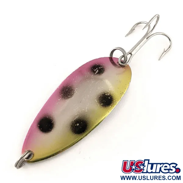 Ražba na zadní straně této 11g (2/5oz) plandavky ji jasně identifikuje jako originální klasiku vyrobenou v USA. Povrchová úprava „Rainbow Trout“ je precizně nanesena a vyznačuje se jemným přechodem od růžového horního okraje k jasně žluté spodní části, s reflexním stříbrnobílým středem doplněným šesti výraznými černými tečkami. Tento exemplář o délce 5,5cm (2 1/4") je v bezvadném stavu a získal hodnocení 5/5. Těžké kovové tělo doplňují odolné nerezové kroužky a silný trojháček, což z něj činí robustní volbu pro nahazování i trolling. Plandavka Acme Little Cleo, označená kódem 11688, je mezi sběrateli známá svým výrazným vyraženým logem „Little Cleo“ a označením hmotnosti na leštěné stříbrné zadní straně.