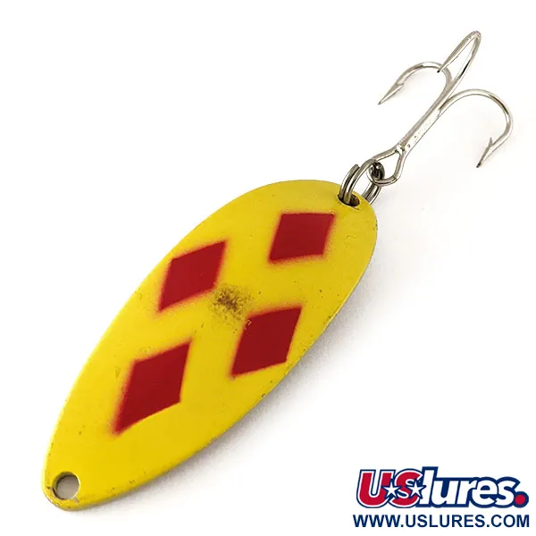Pět červených kár na zářivě žlutém pozadí definuje ikonickou povrchovou úpravu této 11g (2/5 oz) plandavky. Na zadní kovové straně je zřetelně vyraženo jméno „LITTLE CLEO ®“ a hmotnost – tento model značky Acme je skvělým příkladem náčiní vyrobeného v USA. Plandavka o délce 5,5 cm (2 1/4") má specifický hrbatý profil, který je vyvážen pro nahazování i trolling. Původní osazení zůstalo nedotčeno, včetně stříbrného trojháčku připevněného pomocí robustního kroužku. Pro sběratele je stav 5/5 patrný na lesklém povrchu, přestože u centrálního vzoru je viditelná drobná stopa stáří. Tento exemplář s kódem 12330 představuje klasickou barevnou kombinaci, která je stálicí pro lov štik a velkých pstruhů. Zadní leštěná strana udržuje vysoký lesk, který pod vodní hladinou vytváří silné odlesky.