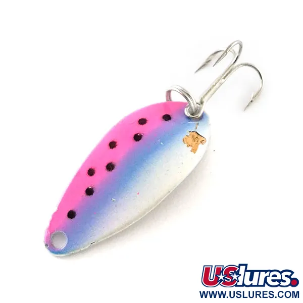 S hmotností 1/8 oz (3,5 g) vyniká vzor Rainbow Trout na této plandavce Acme Little Cleo proti stříbrnému tělu. Nástraha o délce 1 1/4" (3 cm) se vyznačuje barevným přechodem od růžové k modré, doplněným výraznými černými tečkami a malým zlatým logem u kroužku. Na zadní straně kovového těla je vyražen nápis „Acme Little Cleo 1/8 oz“, který odpovídá kódu produktu 13250. Tento v USA vyrobený kus je osazen originálním trojháčkem a kroužky. Stav je hodnocen 4/5, povrch je velmi čistý a barva na přední straně skvěle zachovalá. Specifické zakřivení a silný plát kovu této plandavky pro přívlač jsou typickými znaky řady Little Cleo.