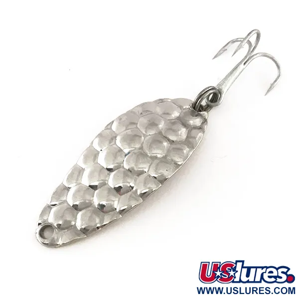 Povrchová úprava z tepaného niklu u této 1/4 oz (7 g) třpytky byla navržena tak, aby maximalizovala odraz světla z různých úhlů pod vodou. Tato Acme Little Cleo (kód produktu 7865) o délce přesně 1 1/2" (4 cm) představuje klasický americký design, který je po generace základem rybářských boxů. Hluboké důlky na přední straně vytvářejí výraznou texturu, zatímco zadní strana zůstává hladce vyleštěná. Robustní kroužek a ostrý trojháček jsou u tohoto exempláře standardem, který je vyvážen pro lehčí přívlač nebo pomalý trolling ve sladkých vodách. Osazení i povrch jsou ve skvělém stavu, s hodnocením 5/5 za čistý povrch a neporušené pokovení. Otvor pro uchycení v hlavové části je čistě vyražen, což umožňuje snadné připojení ke karabince nebo návazci.