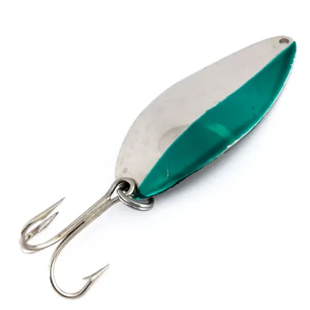 Povrchová úprava této těžké plandavky je svisle rozdělena na poloviny a kombinuje vysoce leštěný nikl s výrazným zeleným pruhem. Acme Little Cleo s hmotností 35g (1 1/4 oz), katalogové číslo 9827, je navržena pro daleké nahazování nebo pro dosažení hlubokých teplotních vrstev při trollingu. Mosazné tělo o délce 8cm (3 1/4") má charakteristický prohnutý profil, díky kterému se tato v USA vyrobená nástraha stala po generace základem výbavy lovců lososů a pstruhů duhových. Na zadní straně je do kovu ostře vyražen název „LITTLE CLEO“. Tento konkrétní kus zůstává ve vynikajícím stavu 5/5 a vykazuje jasný, reflexní povrch. Je osazen silným trojháčkem zajištěným pevným kroužkem a špička je čistě vyvrtána pro karabinku nebo přímé navázání.