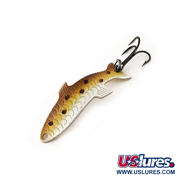 Tato plandavka o hmotnosti 1/8 oz (4 g) a délce 1 1/2" (4 cm) je ukázkovým příkladem historie amerického rybářského náčiní. Charakteristická silueta Acme Phoebe se vyznačuje prohnutým, trojrozměrným profilem rybky, v tomto případě v detailním vzoru Brown Trout / Gold, který věrně napodobuje tečky a texturu šupin drobné potravy. Na zadní straně je do kovu v barvě mosazi jasně vyražen název výrobce, přičemž povrch zůstává čistý a lesklý. Tato konkrétní nástraha, evidovaná pod kódem 11454, je v nepoužitém stavu (hodnocení 6/5), bez jakýchkoli známek pobytu ve vodě nebo oxidace kovových částí. Je osazena ostrým trojháčkem připevněným pomocí robustního kroužku v zadní části. Unikátní hydrodynamický tvar byl navržen pro univerzální použití, což umožňuje efektivní lov jak v mělkých úsecích, tak v hlubších tůních. Její účinnost spoléhá na přirozené odlesky kovu a hloubku malovaných vzorů, které lákají dravce za různých světelných podmínek.