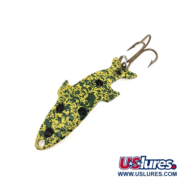 Tento exemplář s prohnutým kovovým tělem pokrývá výrazný vzor 'Frog' tvořený zelenými a žlutými cákanci s výraznými černými tečkami. Nástraha váží 1/8 oz (4 g), měří 1 1/2" (4 cm) a vyznačuje se charakteristickou anatomickou siluetou, díky níž je Acme Phoebe po desetiletí oblíbenou součástí rybářských boxů. Tento konkrétní kus s produktovým kódem 11506 je nepoužitý a zachovává si původní povrchovou úpravu. Na čisté stříbrné zadní straně je v blízkosti středu do kovu jasně vyraženo jméno 'PHOEBE'. Výbava se skládá z ostrého trojháčku s bronzovou povrchovou úpravou, který je k ocasní části připevněn spolehlivým kroužkem. Díky trojrozměrnému raženému designu vykazuje při nahazování i trollingu realistický profil nástražní rybky z mnoha úhlů.