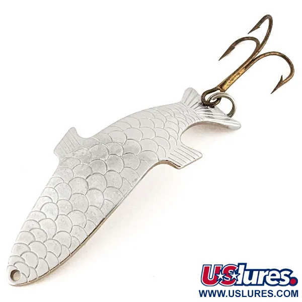 Jemné vzory šupin jsou vyleptány na zakřivené přední straně této poniklované plandavky, což napodobuje realistickou texturu malé nástražní rybky. Na zadní straně je hluboká ražba jména "PHOEBE", charakteristický znak tohoto klasického designu vyráběného firmou Acme v USA. Tento konkrétní kus s produktovým kódem 12140 je ve vynikajícím stavu, hodnocen 5/5 pro své čisté, reflexní povrchy a dobře zachovalé osazení. S hmotností 1/2 oz (14 g) a délkou 2 3/4" (7 cm) využívá nástraha jedinečné hydrodynamické vlastnosti k vytvoření trojrozměrného vzhledu, který zůstává účinný v různých hloubkách. Součástí je robustní trojháček zajištěný kroužkem na ocase a jednoduché vyražené očko na šňůru u hlavy, vhodné pro rychlé i pomalé přitahování v mělké i hluboké vodě.