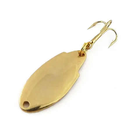 Přesné značení „ACME THUNDERBOLT 1/10 OZ.“ vyražené přímo do kovu na zadní straně charakterizuje tento exemplář o délce 3 cm. Vysoce leštěný zlatý povrch zůstává na celém těle výjimečně čistý a lesklý, což odpovídá hodnocení stavu 5/5. Kód produktu 13211 označuje tuto v USA vyrobenou nástrahu, jejíž katalogová hmotnost je 3,5 g. Konstrukci tvoří prohnutý kovový profil plandavky osazený kroužkem ve zlaté barvě a odpovídajícím trojháčkem. Nahazování těchto plandavek do tekoucích vod nebo sladkovodních revírů s lehkým náčiním umožňuje celokovovému provedení efektivně dosáhnout požadovaných hloubek. Jediný čistě vyvrtaný otvor v přední části slouží jako hlavní bod pro uchycení vlasce.