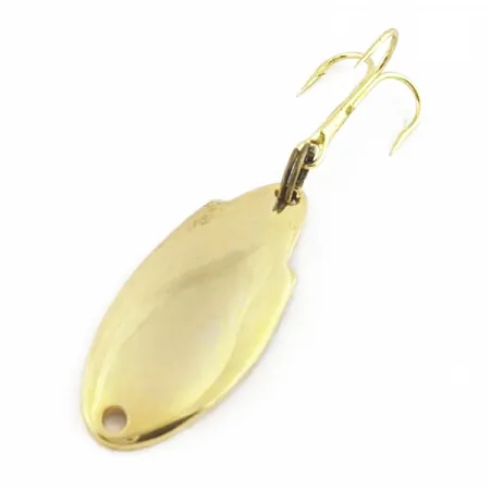 S hmotností přesně 1/8 oz (3,5 g) je Acme Thunderbolt klasickou americkou plandavkou navrženou pro lehkou přívlač. Její tělo ve tvaru kapky má povrchovou úpravu v zářivě leštěné zlaté barvě, která efektivně odráží světlo i v přikalené vodě. Tento konkrétní exemplář o délce 1 1/4" (3 cm), katalogizovaný pod produktovým kódem 24426, vykazuje bezchybný povrch a odpovídá hodnocení stavu 5/5. Lisované kovové tělo se vyznačuje jemným prohnutím, které je charakteristické pro precizní strojírenské zpracování firmy Acme z jejich produkce v USA. Trojháček ve zlatém provedení je připevněn robustním kroužkem, zůstává ostrý a nevykazuje žádné známky používání. Tato velikost v řadě Thunderbolt je často vyhledávána pro lov pstruhů nebo okounů, kde je vyžadován malý profil napodobující přirozenou potravu. Zlatá povrchová úprava pokrývá celý povrch plandavky, včetně prohlubní kolem očka pro vlasec a v místě uchycení háčku.