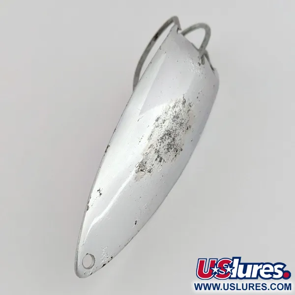 Na spodní straně plandavky jsou jasně vyražena slova „ACME WEEDLESS MINNOW“, což odkazuje na konstrukci patentovanou již v roce 1951. Pracovní část je vybavena unikátním mechanismem s trojháčkem, který zůstává schovaný v ochraně proti vázkám, dokud ryba nezaútočí a háčky se neuvolní. Tento exemplář s klasickým chromovým povrchem vykazuje drobné stopy po pobytu v krabičce, což odpovídá hodnocení stavu 4/5. S délkou 3" (7,5 cm) a hmotností 3/4 oz (24 g) je dostatečně těžká pro daleké a přesné náhozy do husté vegetace nebo mezi lekníny. Vnitřní zakřivení plandavky nese také značku „PAT. PENDING“, což ji řadí do rané historie výroby této americké klasiky. Pro dosažení nejlepších výsledků ji zkušení rybáři vedou pomalu skrz trávu nebo zrychlují tempo v místech s volnou vodou.
