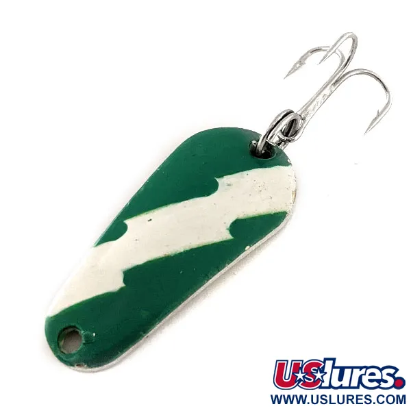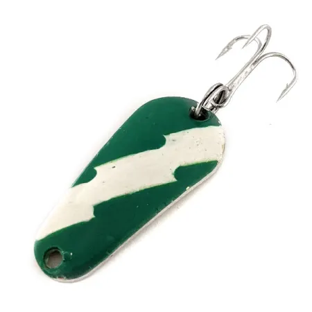 Na leštěné zlaté zadní straně je jasně vyražen název Aero a hmotnost, což identifikuje tuto klasickou americkou plandavku od společnosti Aeroplane Spinner. Nástraha o délce 3,7 cm (1 1/2") má na konvexní straně výrazný smaltovaný povrch, kde zubatý bílý pruh protíná tmavě zelené pole. Tento konkrétní exemplář, identifikovaný kódem 11803, je ve vynikajícím stavu 5/5, přičemž původní lak zůstal ostrý a zářivý. K zadní části je pomocí robustního kroužku připevněn ostrý stříbrný trojháček, připravený k nahazování nebo lehkému trollingu. Hmotnost 7 g (1/4 oz) poskytuje dostatečnou hmotnost pro cílené nahazování v různých vodních podmínkách. Mosazný kov na rubové straně slouží jako vysoce kontrastní záblesk proti lakované horní straně.
