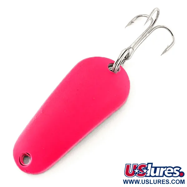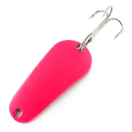 Tato plandavka Aero s kompaktní délkou 3,7 cm (1 1/2") má tělo ve tvaru kapky s vysoce viditelnou fluorescenční růžovou povrchovou úpravou. Pod ultrafialovým světlem se vzhled mění, protože UV reaktivní vrstva vyzařuje sytě červenou záři pro lepší viditelnost za špatných světelných podmínek. Ostrý trojhák je připevněn pomocí kroužku k širšímu konci lisovaného kovu, zatímco na zúžené špičce se nachází čistý otvor pro návazec. Tento exemplář s produktovým kódem 12051 pochází z USA a je ve stavu 5/5 s výrazným a jednotným povrchem. S hmotností 7 g (1/4 oz) je nástraha konstruována pro různé techniky nahazování a vertikální přívlače. Společnost Aeroplane Spinner použila tuto specifickou fluorescenční barvu ke zvýraznění profilu svých klasických nástrah řady 'Aero'.