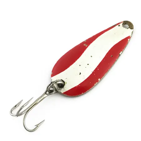 Tato plandavka Aeroplane Spinner o hmotnosti 1/4 oz (8 g) je 2" (5 cm) klasika amerického designu rybářského náčiní. Přední strana je zdobena výrazným červeno-bílým pruhovaným vzorem, který vykazuje drobné stopy a mírnou ztrátu barvy podél okrajů, což odpovídá hodnocení stavu 4/5. Na zadní straně mosazného povrchu je jasná ražba „Aero“, identifikující konkrétní model. Tato nástraha, označená produktovým kódem 9206, obsahuje trojháček v původním stylu. Mosaz postupem času získala bohatý tmavý tón, který vytváří ostrý kontrast k lakovanému emailu na protilehlé straně. Na bílých pruzích jsou patrné drobné oděrky, což naznačuje, že tento kousek strávil nějaký čas ve vodě.