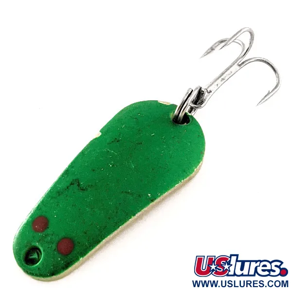 Tato kompaktní plandavka od Aeroplane Spinner, měřící přesně 1 1/2" (3,7 cm), má na přední straně zářivě zelený povrch doplněný dvěma výraznými červenými tečkami poblíž očka. S hmotností 1/4 oz (7 g) je váha soustředěna pro přesné nahazování v různých vodních podmínkách. Zadní strana odhaluje čistý zlatý povrch, který tvoří klasický kontrast k primárnímu zelenému odstínu. Pod ultrafialovým světlem vykazuje vrstva „Aero UV“ (kód produktu 11792) svou specializovanou povahu intenzivním žhavením, což je taktická výhoda v hlubších nebo zakalených vodách. Osazení tvoří jeden ostrý trojháček zajištěný kroužkem, což dokládá účelně zaměřený design běžný u nářadí vyrobeného v USA. Tento konkrétní kus je ve výjimečném stavu 5/5 a zachovává si svůj původní lesk na lakovaných i kovových površích.