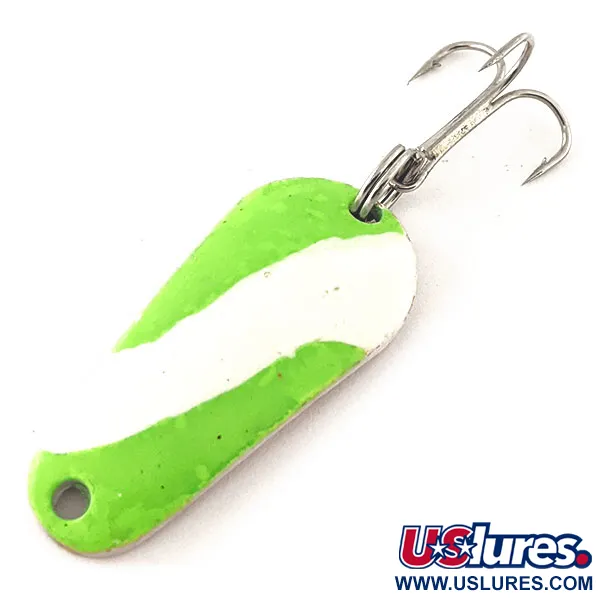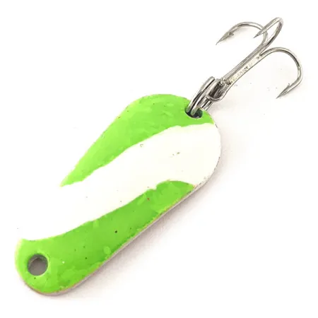 Pod výrazným zeleným a bílým fluorescenčním nátěrem této americké plandavky se skrývá měděný základ. S délkou 3,7 cm (1 1/2") je nástraha navržena pro vysokou viditelnost, zejména proto, že barva silně reaguje na UV světlo a vytváří zářivý efekt. Tento exemplář Aeroplane Spinner, označený kódem 12054, váží 7 g (1/4oz), což poskytuje dostatečnou hmotnost pro přesné vedení ve vodním sloupci. Povrchová úprava je ve vynikajícím stavu (5/5), přičemž vlnitý vzor zůstává ostrý a neporušený. Jeden kroužek spojuje ostrý trojhák se zadní částí třpytky. Zúžený profil napovídá stabilní klesání při jiggování nebo rytmické blýskání při přitahování.