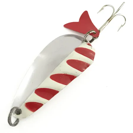 Výrazný vlnitý okraj této kanadské třpytky AL&W Half Wave, registrované v roce 1956, poskytuje strukturální profil, který se u moderního vybavení vidí jen zřídka. Tento konkrétní exemplář s kódem produktu 6652 váží 2/3 oz (19 g) a měří 2 3/4" (7 cm). Přední strana se vyznačuje precizním vzorem šikmých červených pruhů na bílém podkladu, přičemž v horní části listu zůstává přiznán původní niklový povrch. Na zadní straně je do leštěného povrchu jasně vyraženo logo AL&W Tackle a datum registrace designu. Na zadním kroužku je namontováno průsvitné červené plastové křidélko, které slouží jako vizuální dráždidlo těsně nad původním trojháčkem. Stav nástrahy je 5/5, což svědčí o velmi dobrém zachování lakovaných i kovových povrchů. Dva robustní kroužky u úvazu i u háčku naznačují, že tato třpytka byla vyrobena pro vysokou odolnost při nahazování i trollingu.