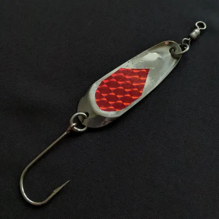 Červená prizmatická páska vytváří výrazný kontrast na poniklovaném těle této 7g klasiky. Plandavka Andy Reekers měří přesně 6 cm a představuje zlatou éru výroby rybářských potřeb na západním pobřeží USA. Osazení zahrnuje velký jednoháček upevněný pevným kroužkem a integrovaný obratlík pro zamezení kroucení vlasce. Nástraha s kódem produktu 20373 si zachovává čistý vzhled se stavem hodnoceným jako 4/5, vykazujícím pouze mírné známky svého stáří. Prodloužený, štíhlý profil je typický pro plandavky určené pro univerzální přívlač nebo trolling.