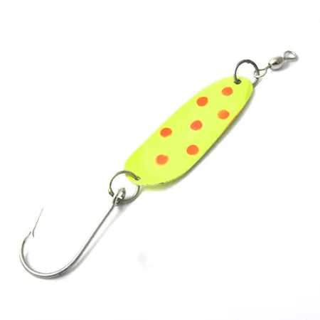 Třpytka Andy Reekers 3, zdobená červenými kruhy na zářivě žlutém pozadí, odráží osobitý vizuální styl amerického vybavení pro trolling z poloviny minulého století. Tento exemplář o hmotnosti 4,5 g (3/16 oz), označený kódem produktu 0440, má jednoduchý, ale účinný profil navržený pro stabilní pohyb ve vodním sloupci. Zadní strana je v celožlutém provedení s černo-žlutým okem u špičky, které slouží jako sekundární bod pro sledující ryby. Je vybavena jednoháčkem a předním obratlíkem, které jsou nezbytné pro udržení stability a zamezení kroucení vlasce při trollingu. Předmět je ve stavu 5/5, přičemž si zachovává původní tovární povrchovou úpravu těla i veškerých kovových prvků.
