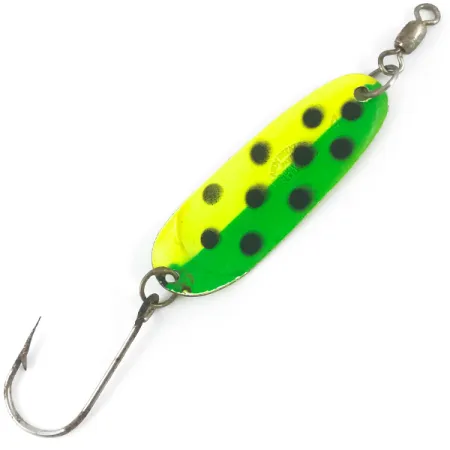 Tato klasická trollingová plandavka o délce přesně 6 cm se vyznačuje výrazným vysoce kontrastním povrchem navrženým pro maximální viditelnost. Tento model Andy Reekers UV o hmotnosti 7 g má charakteristickou přední stranu svisle rozdělenou mezi jasně žlutou a zářivě zelenou, doplněnou řadou velkých černých teček. Zadní strana nástrahy je opatřena sytě žlutým UV reaktivním nátěrem, což je technická volba určená pro hlubinný trolling, kde je průnik světla omezený. Nástraha je připravena k okamžitému použití, obsahuje velký jednoháček a horní obratlík spojený robustními kroužky. Vyrobeno v USA pod produktovým kódem 4691, niklový základ poskytuje odolný podklad pro lakování. Tento exemplář je ve vynikajícím stavu 5/5 a vykazuje dobře zachovalý povrch typický pro vysoce kvalitní vintage nálezy. Barva zůstává živá na raženém kovovém těle, což je charakteristický znak designu Reekers pro lovce lososů a pstruhů.