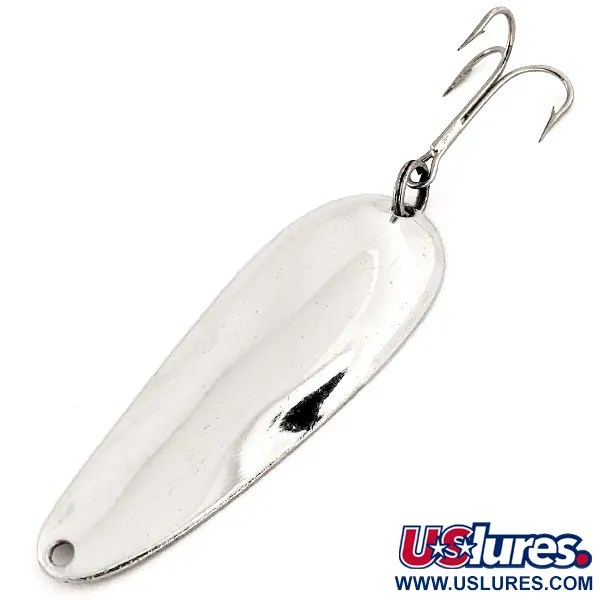Tato klasická ukázka americké rybářské historie váží přesně 1/2 oz (14 g) a vyznačuje se jasným niklovým povrchem, který zůstává pozoruhodně čistý. Tělo ve tvaru kapky měří 2 3/4" (7 cm) a nese originální tovární osazení, včetně robustního kroužku a ostrého trojháčku na zadním konci. Na konkávní straně je Aqua Spoon jasně označena svým názvem a nápisem „MADE IN U.S.A.“, což je detail často vyhledávaný sběrateli mapujícími produkci firmy Nebco z poloviny století. Tento exemplář s produktovým kódem 12969 je ve stavu 5/5, vykazuje vysoce reflexní povrch a čisté hrany. Jednoduchý, funkční design této plandavky podtrhuje přímočaré výrobní standardy té doby.