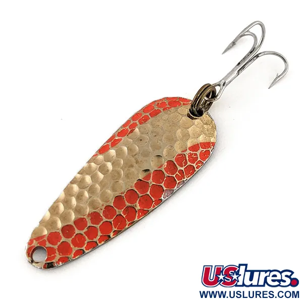Tepaná zlatá textura definuje povrch této klasické 1/4 oz (7 g) plandavky Nebco Aqua Spoon a zachycuje světlo díky svému tradičnímu důlkovanému profilu. Přední strana o délce 2" (5 cm) je doplněna výrazným oranžovo-červeným vzorem šupin, který zůstává na nástrahu z této éry pozoruhodně ostrý. Na hladké zlaté zadní straně jsou jasně vyraženy nápisy „AQUA SPOON“ a „MINNEAPOLIS“, což je znakem jejího amerického původu z poloviny minulého století. Tento exemplář, vedený pod kódem 13078, získal hodnocení stavu 5/5, bez výrazné ztráty povrchové úpravy nebo osazení. Originální mosazný kroužek je bezpečně připevněn ke stříbrnému trojháčku, což odráží robustní konstrukci, na kterou se rybáři spoléhali při lovu ve sladkých vodách. Kapkovitý tvar je zakončen přesně vyvrtaným otvorem pro vlasec na užším konci, který zajišťuje správný chod při přitahování.