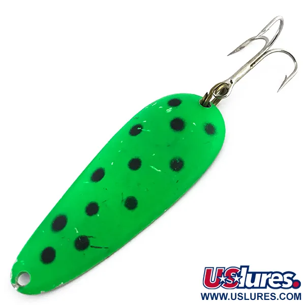 Tento vintage kousek, posázený černými tečkami na zářivě zeleném podkladu, vyzdvihuje klasickou estetiku žabího vzoru, který si oblíbili rybáři v polovině minulého století. Hmotnost 16 g (3/5 oz) poskytuje dostatečnou zátěž pro daleké náhozy k okrajům travin nebo pro trolling podél zlomů hloubek. Zadní strana plandavky je z leštěného niklu, což vytváří ostrý kovový odlesk, který kontrastuje s malovanou přední částí. Vyrobeno v USA firmou Nebco pod produktovým kódem 8841. Plandavka má klasický kapkovitý profil o délce 7,5 cm (3"). Je ve skvělém stavu s hodnocením 4/5, vykazuje pouze drobné známky stáří na kovových prvcích. Velký, ostrý trojhák je připevněn pomocí kroužku, takže je nástraha připravena do sbírky i k vodě. V horní části plandavky je jeden čistě vyvrtaný otvor pro zajištění návazce.