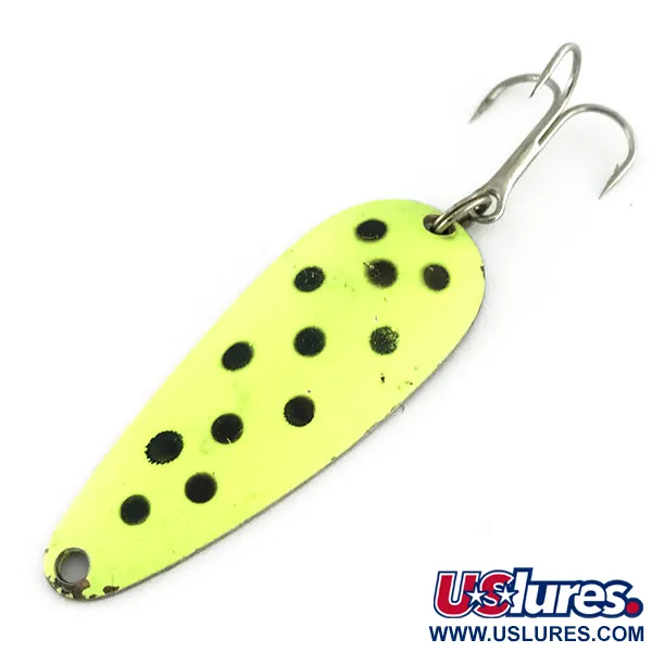 Na bronzové zadní straně této 9g (1/3 oz) kovové plandavky jsou jasně vyraženy klasické značky Blue Fox a původ „USA“. Tato Aqua Spoon o délce 5,5 cm (2 1/4") nese produktový kód 9525 a vyznačuje se vysoce viditelnou chartreuse přední stranou s třinácti černými tečkami. Exemplář je ve stavu 4/5, vykazuje lehké známky používání v podobě mírné ztráty laku na okrajích, ačkoli podkladový kov a ražené nápisy zůstávají ostré. Konstrukce zahrnuje robustní trojháček zajištěný kroužkem, což z ní činí spolehlivou volbu pro přívlač nebo trolling v různých světelných podmínkách. Kontrast mezi neonově lakovaným povrchem a kovovou mosaznou spodní stranou je základním designem značky z éry její americké výroby. Poblíž očka na vlasec je vyraženo malé logo s hlavou lišky, které dodává punc autenticity pro sběratele vintage rybářského náčiní.