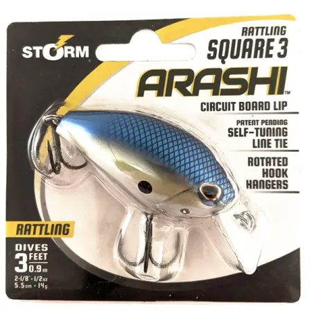 S váhou 14g (1/2oz) je Storm Arashi Rattling Square 3 postaven na tenké lopatce z tištěného spoje, která umožňuje rychlé potopení do pracovní hloubky 0,9m (3ft). Tělo o délce 5,5cm (2 1/4") je v barvě Black Silver Shad se šupinatým modro-stříbrným hřbetem, stříbrnými boky a černou tečkou u žaber. Technické detaily, jako je samonastavovací očko a otočená očka na háčky, prokazují zaměření značky Storm na výkon, navržený tak, aby nástraha snadněji procházela vázkami. Tento nepoužitý kus s kódem produktu 11675 je v originálním balení. Konstrukce obsahuje vnitřní chrastítko a hranatý profil lopatky určený k odrážení od podvodních překážek při nahazování i trollingu.