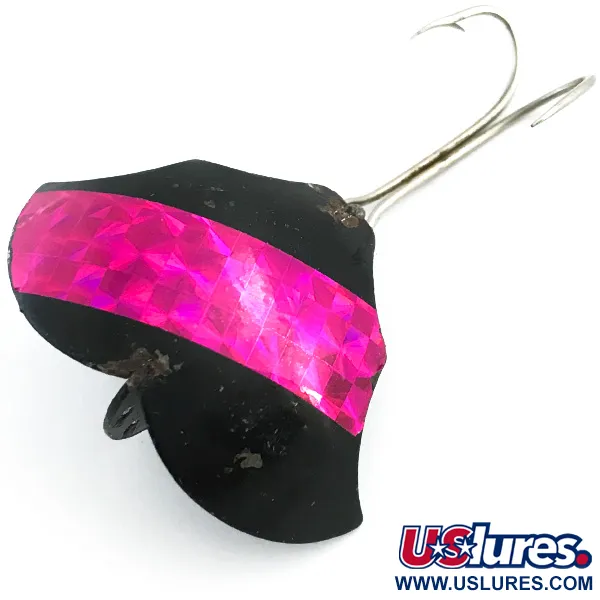 Tato nástraha o hmotnosti 14 g (1/2 oz) má kompaktní tělo o délce 3,5 cm (1 1/2"), které demonstruje jedinečnou konstrukci společnosti Prescott Spinner Company. Černě smaltovaný povrch je protnut širokým holografickým purpurově růžovým pásem, který poskytuje vysoce kontrastní reflexní prvek na tmavém podkladu. Na vnitřní straně křídlové struktury je přímo do kovu vyražen název „Baby“, který tento model identifikuje jako Baby Bat pod produktovým kódem 5456. Osazení tvoří robustní dvojháček připevněný k drátěnému očku, což je konstrukce určená pro odolnost při zachování bezpečného držení. Tento exemplář vyrobený v USA si udržuje stav 4/5, vykazuje dobře zachovaný lak a čistou holografickou aplikaci, pouze s mírnými známkami stáří na ramínku háčku a podél kovových hran.