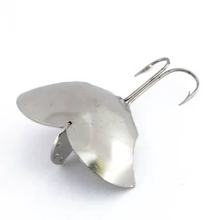 Leštěný nikl pokrývá každý povrch této 14g (1/2oz) kovové plandavky a odráží světlo s brilancí, kterou sběratelé okamžitě rozpoznají jako charakteristický znak společnosti Prescott Spinner. Baby Bat o délce přesně 3,5 cm (1 1/2"), uváděná pod kódem produktu 9883, je fascinujícím kusem vintage výbavy vyrobeným v USA. Její výrazná silueta napodobuje netopýra v letu a má křídla vyražená z odolného kovového plátu, který si zachovává zrcadlový lesk. V přední části nástrahy se nachází vertikální kýl s několika otvory pro uchycení šňůry, což umožňuje přesné nastavení hloubky v závislosti na tom, do kterého otvoru připnete karabinku. Zadní část je osazena robustním dvojháčkem, který je bezpečně připevněn k hlavnímu tělu. Tento konkrétní exemplář získal hodnocení stavu 5/5, vypadá výjimečně čistě, má ostré hroty háčků a zářivý povrch. Poměr hmotnosti k velikosti této kovové nástrahy navržené pro přívlač nebo vertikální jigging zajišťuje, že efektivně dosáhne hlubších struktur.