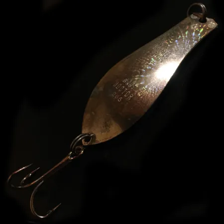 Hluboko do kovového povrchu vyražená značka „BABY DOCTOR 265“ označuje tuto 1/3oz (10g) plandavku jako klasiku od Prescott Spinner. Tato v USA vyrobená třpytka s produktovým kódem 5642 měří na délku 2 1/2" (6,5 cm). Barva „Crystal“ využívá holografickou techniku nanášení, která byla ukončena do roku 1980, což sběratelům pomáhá určit stáří tohoto exempláře. Reflexní povrch je zachovalý a lesklý, což odpovídá hodnocení stavu 4/5. Robustní kroužky spojují komponenty včetně ostrého trojháčku určeného pro sladkovodní trolling nebo přívlač. Jednoduché očko pro vlasec je upevněno na užším konci těla ve tvaru kapky.