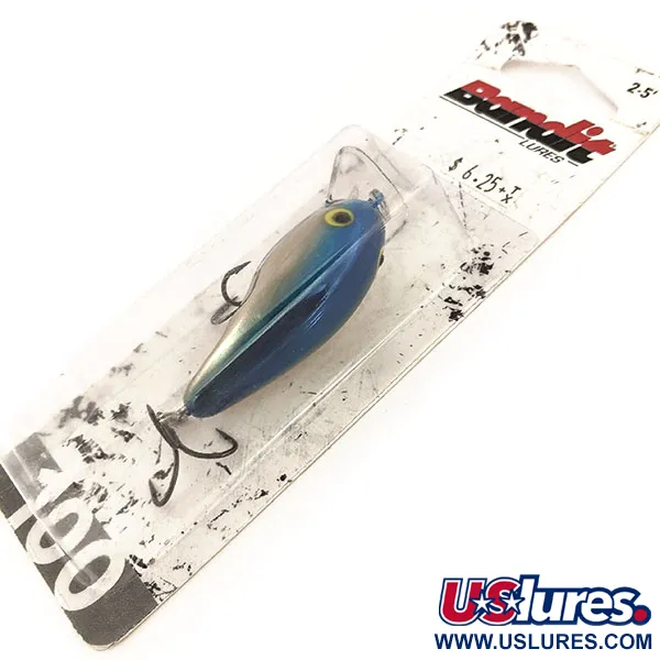 Tento mělce potápivý wobler o délce přesně 5 cm (2") je základním prvkem pro lov candátů a štik. Barevné provedení se vyznačuje metalicky modrým hřbetem, který přechází do zářivých chromových boků, doplněných jasně žlutým okem pro klasický vzhled. S hodnocením 6 je nástraha nepoužitá a uchovaná v původním obalu s průhlednou přední stranou. Váží 7 g (1/4 oz) a je navržena pro ponor v hloubkách mezi 0,6 a 1,5 m (2-5 ft) při nahazování nebo trollingu. Tento konkrétní Bandit 100 (kód produktu 12899), vyrobený v Guatemale, nese odkaz rané výroby této značky. Břicho a ocas jsou osazeny ostrými černými trojháčky, které nevykazují žádné známky stáří.