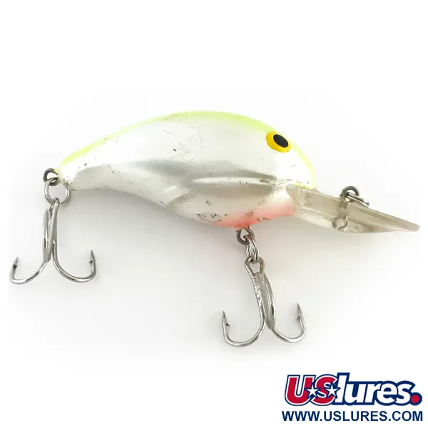 Chromované boky a výrazný chartreuse hřbet charakterizují tento specifický model ze série Bandit 200. S hmotností 8,5 g (1/3 oz) a délkou 5 cm (2") je tento crankbait navržen pro dosažení hloubek až do 3 m (9,8 ft). Vizuální profil doplňuje jemný oranžovo-červený nádech na hrdle a klasické žluté oko s černou zornicí. Tato plovoucí nástraha, vyrobená v USA, je vybavena vnitřním chrastítkem pro akustický efekt při nahazování nebo trollingu na štiky a candáty. Čirá, pevná lopatka ukazuje na konstrukci určenou pro střední hloubky. Nástraha s produktovým kódem 8529 je v dobrém stavu s hodnocením 4/5 a vykazuje lehké známky používání, které jí dodávají vintage charakter. Původní osazení zahrnuje dva ostré trojháčky bezpečně připevněné k břišnímu a ocasnímu očku.