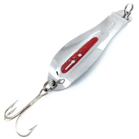Leštěné niklování poskytuje vysoce lesklý povrch kovovému tělu této v USA vyrobené odhozové plandavky o hmotnosti 17 g (3/5 oz). Středem čepele prochází výrazný zapuštěný červený kanálek, který vytváří silný vizuální kontrast k reflexnímu stříbrnému povrchu. Model Bayou Special, označený produktovým kódem 9847, se vyznačuje raženým štítkem poblíž očka pro uchycení šňůry, což je charakteristický znak americké výroby poloviny minulého století. Při délce 8,5 cm (3 1/4") výbavu tvoří velký trojháček zajištěný masivním kroužkem. Povrchy jsou čisté a zachovalé, což odpovídá hodnocení stavu 5/5 bez výrazné ztráty pokovení. Její kapkovitý tvar je vyvážen pro daleké hody a je vhodný pro prezentace v hluboké vodě, kde jsou záblesky a viditelnost pro rybáře klíčové.