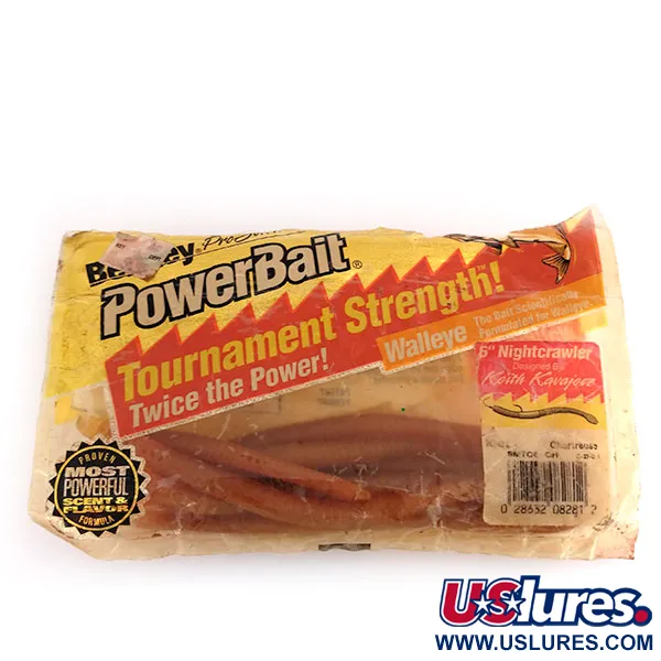 Tyto 15,2 cm (6 palců) dlouhé Berkley PowerBait Nightcrawlers, navržené legendárním profíkem na lov candátů Keithem Kavajeczem, mají klasickou špičku ocasu v barvě chartreuse, která slouží jako vizuální spouštěč v kalné vodě. Toto balení, katalogizované pod kódem produktu 9620, pochází z éry „Tournament Strength“ a obsahuje zapracovanou pachovou a chuťovou formuli, která byla uváděna na trh s „dvojnásobnou silou“ pro závodní rybolov. Z původního balení po deseti kusech zbývá sedm nástrah, které si zachovávají svou vláčnou texturu a výrazný barevný profil Chartreuse, přecházející z přirozeného hnědého těla do jasně žlutozeleného konce. Design napodobuje segmentovanou anatomii skutečné dešťovky, což je poznávací znamení řady PowerBait kladoucí důraz na texturu a realismus. Tyto gumy vyrobené v USA jsou ve stavu 5/5 a stále nesou silnou vůni, která je výrazně inzerována na historickém žluto-červeném obalu. Model 9620 byl základním kamenem vybavení pro lov candátů během vzestupu profesionálních rybářských okruhů.