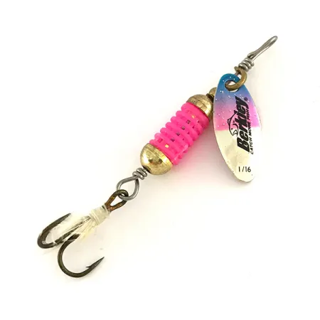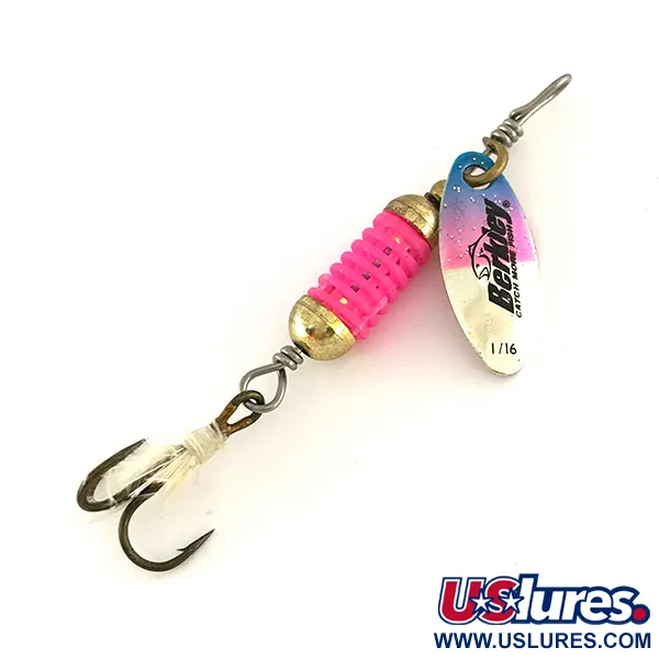 Růžové žebrované segmenty tvoří centrální pachovou komoru této Berkley Scent Vent, což je konstrukce speciálně navržená tak, aby udržela tekuté atraktanty během nahazování a navíjení. Tato v USA vyrobená rotační třpytka s produktovým kódem 7885 váží 3/32 oz (2,5 g) a měří celkem 2 1/4" (5,5 cm). Niklovaný list je v horní části zdoben jemným modro-růžovým přechodem vedle historického loga Berkley. Pokud jde o osazení, trojháček s bílým peřím dodává pod zatíženým tělem jemný vizuální profil. Stav je hodnocen jako 5/5, přičemž zlatavé korálky a drátěné omoty zůstávají lesklé a růžový materiál komory vypadá zachovale. Na ploše listu je viditelná ražba 1/16, která indikuje specifickou velikost listu použitou pro tuto konfiguraci 3/32 oz (2,5 g).