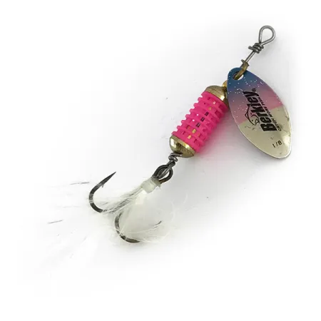 Růžový žebrovaný plast tvoří středovou klec „Scent Vent“ této specializované rotační třpytky, což je konstrukce určená k udržení tekutých atraktantů během nahazování a navíjení. Nástraha o délce 6 cm (2 1/4") a hmotnosti 3,6 g (1/8 oz) je vybavena niklovým listem s jemným modro-růžovým gradientním potiskem a raženým logem výrobce. Tento exemplář s produktovým kódem 8141 obsahuje na ocase bílý opeřený trojhák pro větší vizuální objem ve vodě. Vyrobeno v USA, konstrukce využívá mosazné korálky k vymezení prostoru pro tělo rozptylující pach podél drátěné osy. Celkové zachování kovových a plastových součástí je výjimečné, což odpovídá hodnocení stavu 5/5.