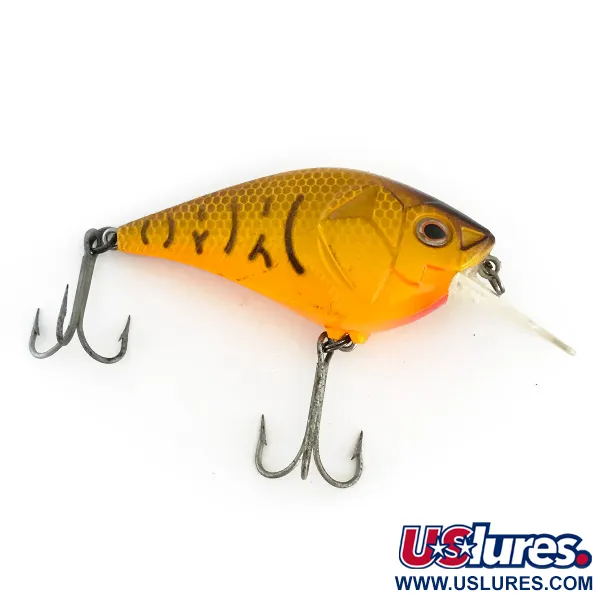 Výrazná zlatavě žlutá povrchová úprava Tiger definuje tento 14g (1/2oz) wobler typu crankbait, který se vyznačuje detailním vzorem šupin ve tvaru včelí plástve podél hřbetu. Společnost Berkley vyvinula model Squarebull, zde s kódem produktu 8377, v délce 7 cm (2 3/4") pro specializovaný lov přívlačí. Technické provedení zahrnuje čirou hranatou lopatku, která umožňuje hloubku ponoru od 0,9 m (3 stopy) do 2,1 m (7 stop). Vizuální detaily jsou velmi výrazné, včetně tmavě hnědého hřbetu, který přechází do jasně oranžového břicha s červeným akcentem na hrdle. Uvnitř je tento zvukový, plovoucí model konstruován pro emisi zvuku a optimální vztlak. Původní osazení, včetně obou trojháčků, je v nepoužitém stavu, což odpovídá hodnocení stavu 5/5. Velké, realistické oči jsou vsazeny do tvarovaných skřelí, což podtrhuje řemeslné zpracování této nástrahy vyrobené v USA.