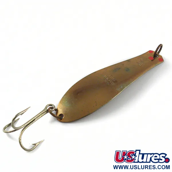 Název „BIG DOCTOR 285“, zřetelně vyražený do mosazného těla, identifikuje tuto robustní plandavku od společnosti Prescott Spinner z Wisconsinu. Tato nástraha vyrobená v USA o hmotnosti 30 g (1 oz) a délce 11 cm (4 1/4") je konstruována pro dosažení hlubších vrstev vody při nahazování i trollingu. Bronzová (mosazná) povrchová úprava má jemný, patinovaný vzhled, doplněný třemi výraznými červenými tečkami u očka pro navázání, které slouží jako klasický vizuální prvek. Velký trojháček je připojen pomocí odolného kroužku v základně, což zajišťuje pevné spojení pro zdolávání velkých sladkovodních druhů ryb. Tento kus s produktovým kódem 2903 je ve stavu 4/5, vykazuje lehké známky používání, ale zůstává plně funkční a robustní. Konstrukce je typická pro polovinu století spolehlivé americké výroby kovových nástrah, přičemž na kovovém povrchu je vyraženo i sídlo výrobce.